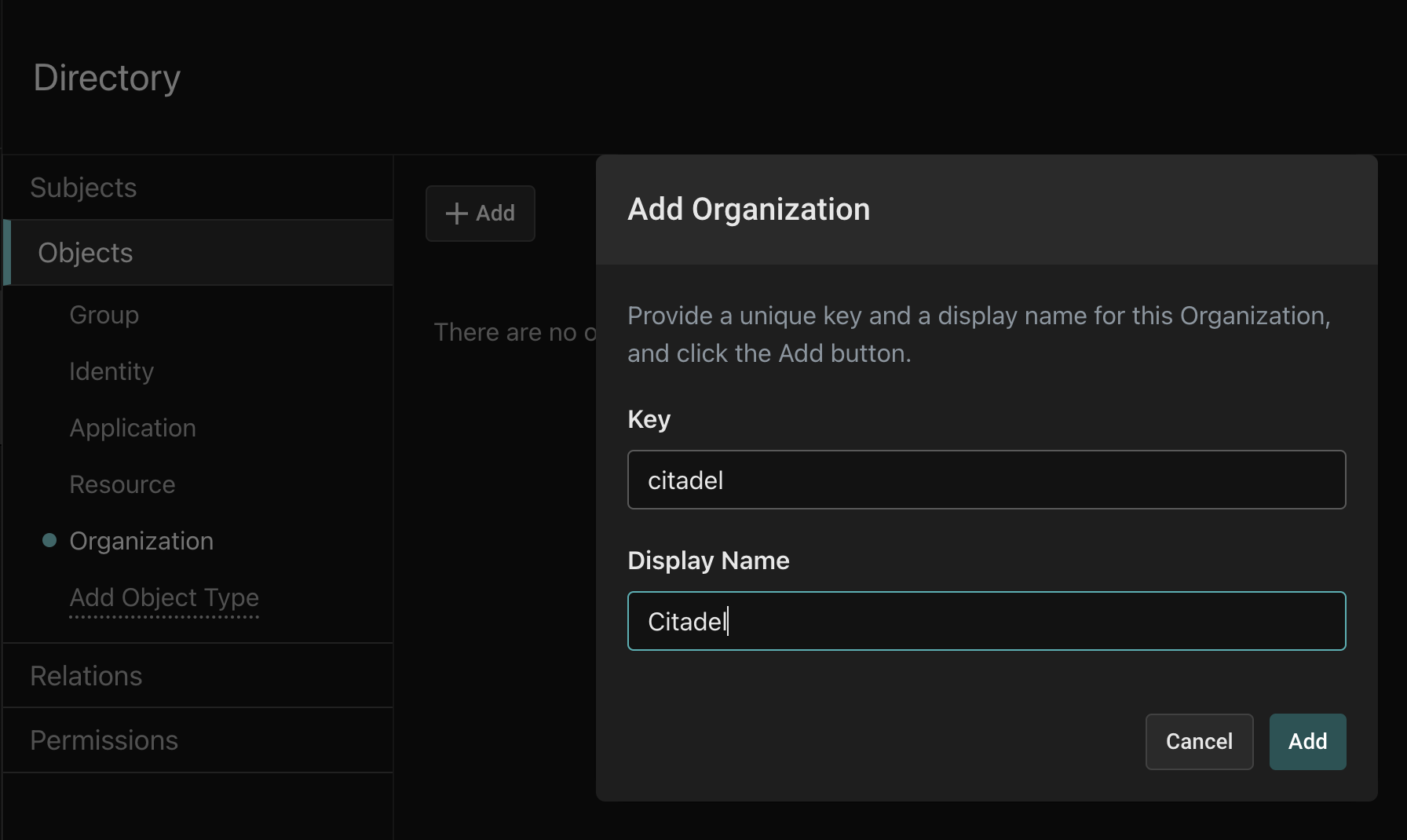 Click the "Add Object Type" link in the Directory sidebar to create a new object type, and call it "Organization".
